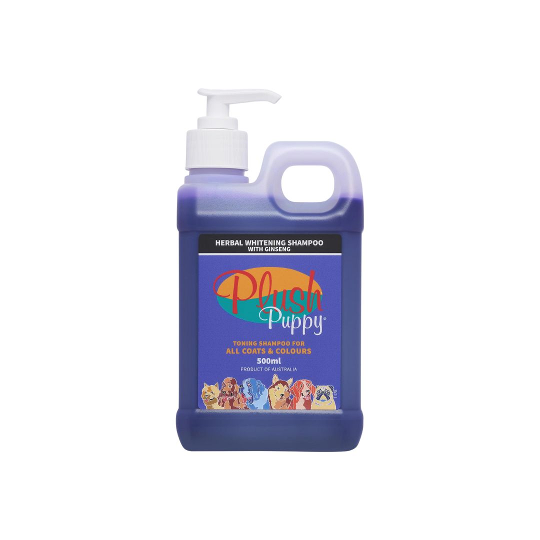 Plush Puppy® Herbal Whitening Shampoo is primarily derived from organic sources with Ginseng extracts, protein, and a violet tone combined in a rich formula that works brilliantly to whiten whites and intensify darker colours.