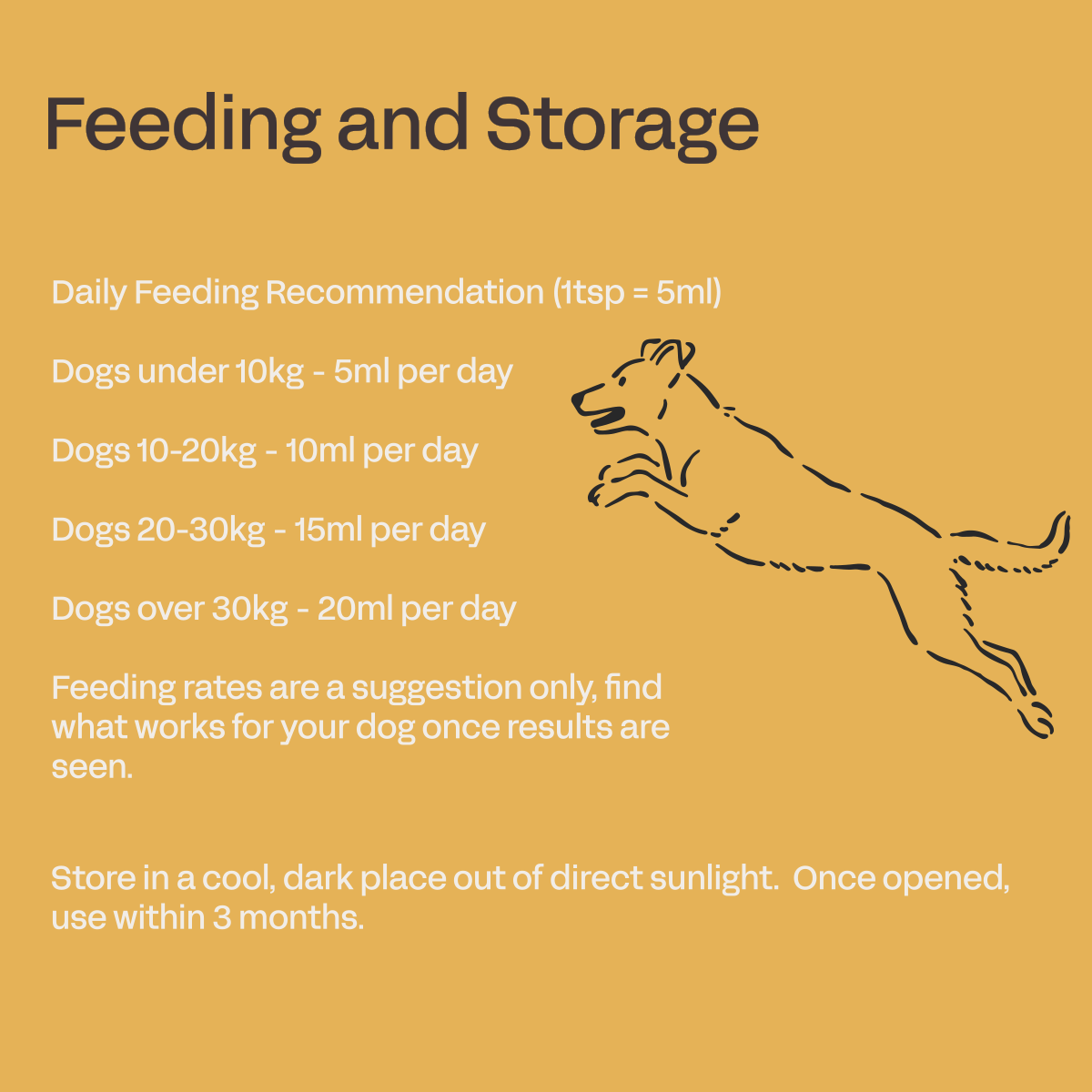 This powerful oil blend contains high levels of Glucosamine & Chondroitin to promote healthy joints, ligaments and connective tissues. Rich in anti-inflammatory Omega 3 from Flax Seed Oil and NZ mussels to put the spring back into your dog’s step and let them live life to the full. Unleash your pooch to play, run and jump with no limits!