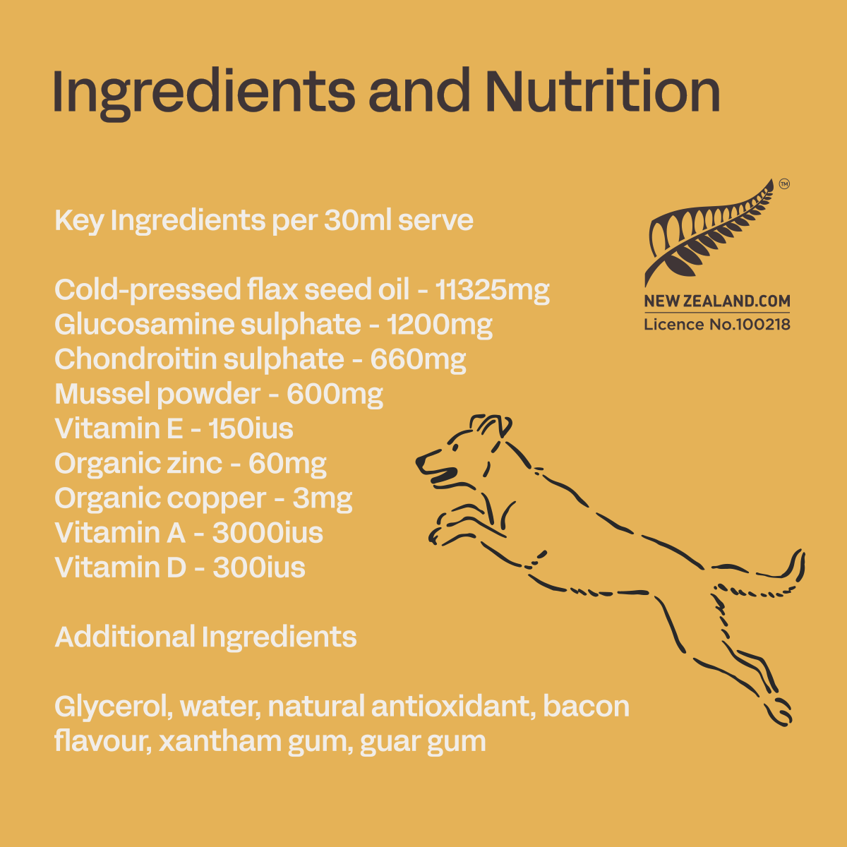 Ingredients | 100% natural cold-pressed flax seed oil, glycerol, water, glucosamine sulphate, bacon flavour, green lipped mussel powder, natural vitamin E, organic zinc, natural antioxidant, organic copper, vitamin A, vitamin D.