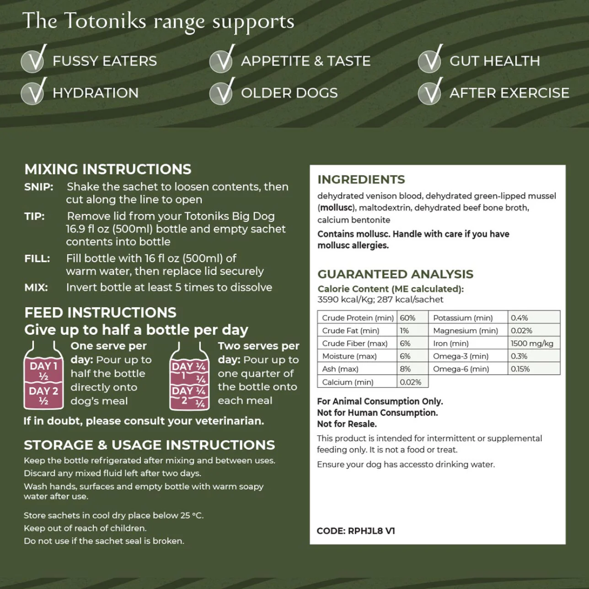 One serve per day: Pour up to half the bottle directly onto dog’s meal Two serves per day: Pour up to one quarter of the bottle onto each meal If you have more than one dog to feed, simply mix up and pour the right amount to ensure each dog gets half a bottle a day. If in doubt, please consult your veterinarian.