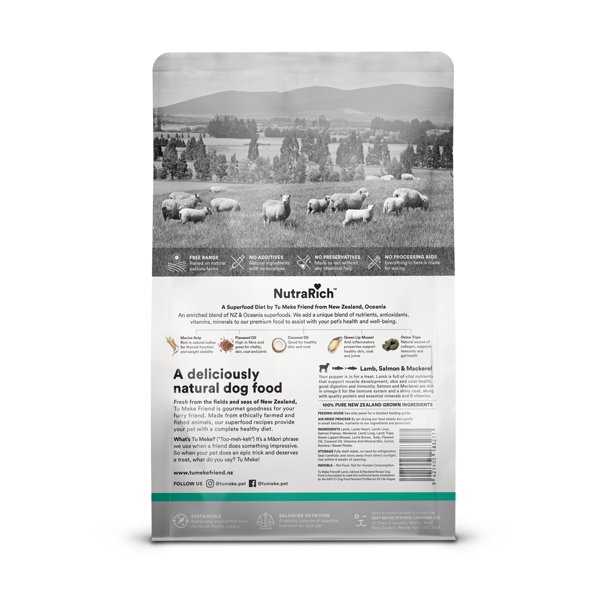 Tu Meke Friend® Lamb, Salmon & Mackerel Recipe Dog Food is formulated to meet the nutritional levels established by the AAFCO Dog Food Nutrient Profiles for All Life Stages including Large Breed Puppies.