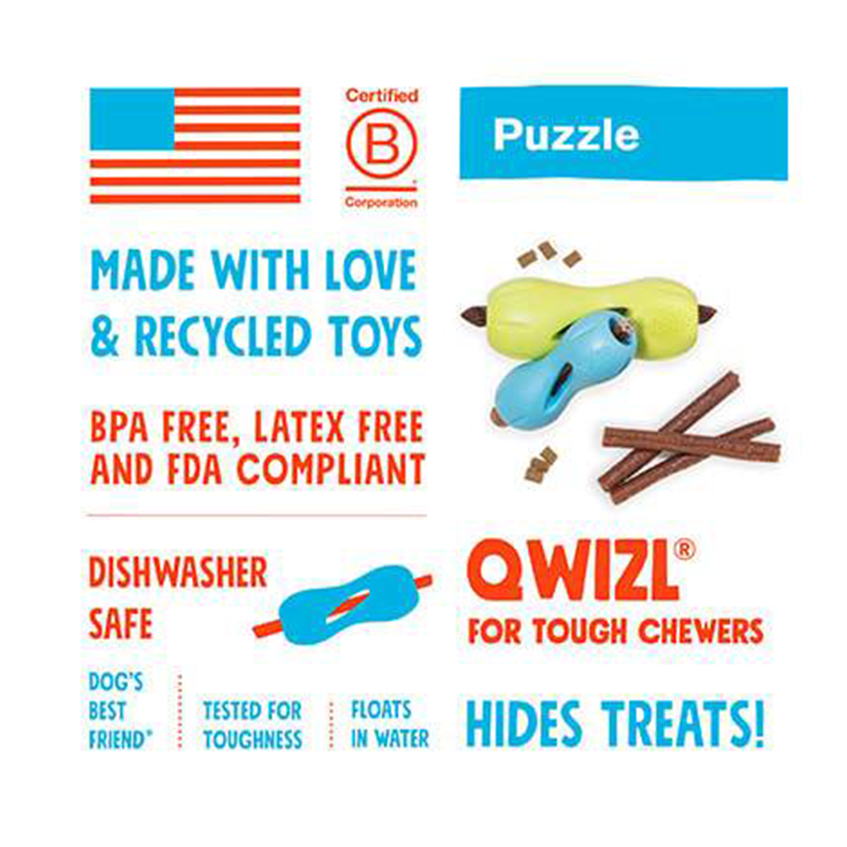 This award-winning toy is brilliantly designed to extend the life of expensive dog treats while keeping dogs busy. The side openings release scent and taste while the continuous interior hole allows treats to extend out. Flexible ridges grip multiple sizes of treats. One of our toughest dog toys, Qwizl is also fun to toss, fetch, and chew even after the treats are gone. The curved shape makes the toy easy for dogs to hold in place with paws