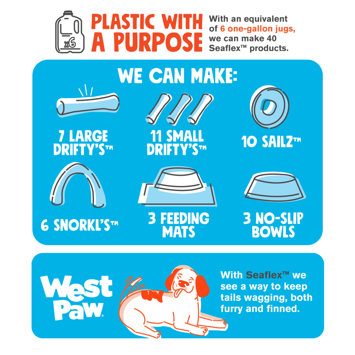 Snorkl is designed for dogs who love bones, boomerangs, and tug. Snorkl's fun tug shape makes it perfect for high energy dogs and great for human and dog play or dog and dog play. Snorkl takes it all like a champ: moderate-chewing, high-energy frolicking, boomerang bouncing, and of course, dishwasher cleanup. Made from non-toxic, infinitely recyclable Seaflex™, Snorkl lets your furbaby play rough while being gentle on the planet.