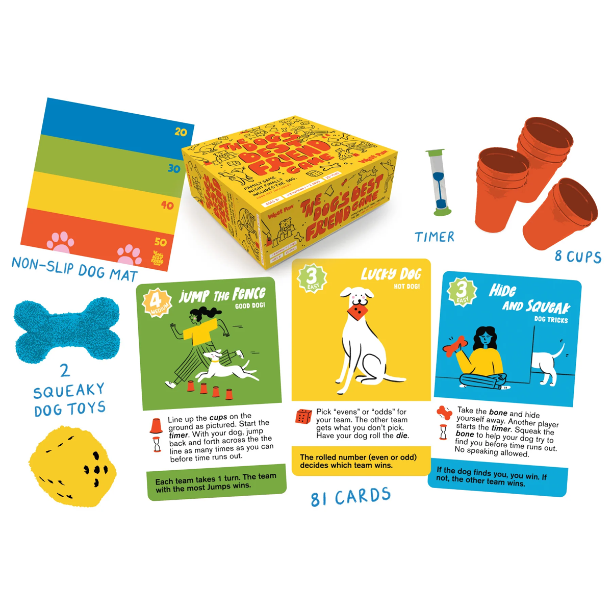 - Game contains: 81 challenge cards; 5 training tip cards; 8 plastic cups; 1 no-slip playing mat; 2 plush dog toys; 1 sand timer; Rule Sheet and LOTS of FUN!